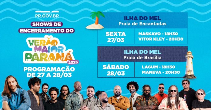 A Ilha do Mel, um dos principais cartões-postais do Litoral, será o palco de uma despedida nova do Verão Maior Paraná. Nos dias 27 e 28 de março, o festival promove quatro grandes shows nacionais: Vitor Kley, Maskavo, Lagum e Maneva.
