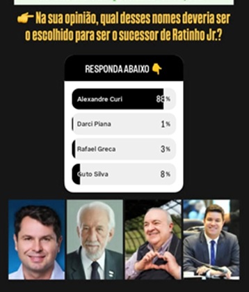 Como o governador Ratinho Junior (PSD) ainda não se decidiu a qual pré-candidato dará apoio oficial para sua sucessão ao Governo do Estado, sites de notícias e grupos de Whats da direita estão fazendo enquetes pelas redes sociais para medir a temperatura, já que, hoje, há um clima de expectativa e tenso em torno dessa “bênção”. Uma dessas enquetes, feitas na capital e região metropolitana, no final de semana e que chegou às minhas mãos, na redação do jornal, fazia a seguinte pergunta: “Na sua opinião, qual desses nomes deveria ser o escolhido para a sucessão de Ratinho Junior?”.