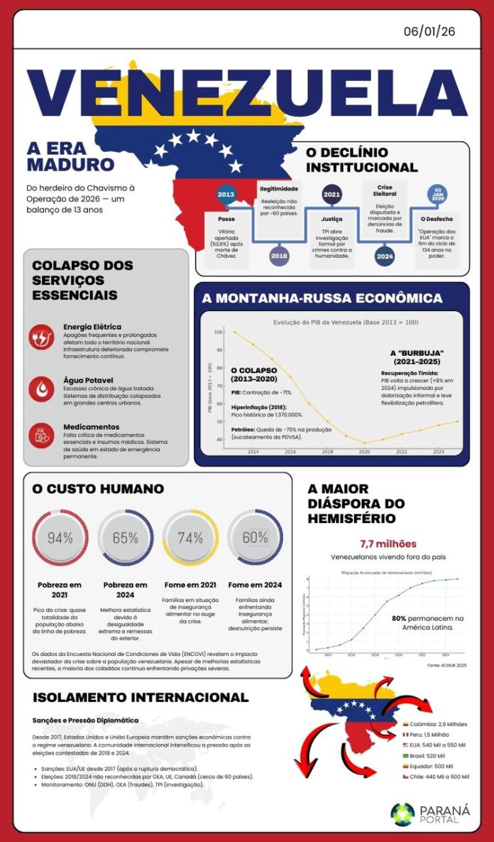 Dados da ONU apontam que a Venezuela sofreu cuma ontração econômica de cerca de 70% entre 2013 e 2020, hiperinflação superior a 130 mil por cento em 2018 e a migração de mais de 7 milhões de pessoas. O Tribunal Penal Internacional conduz investigação sobre supostos crimes contra a humanidade cometidos pelo governo de Maduro em 2017 . - Sinal geopolítico:
