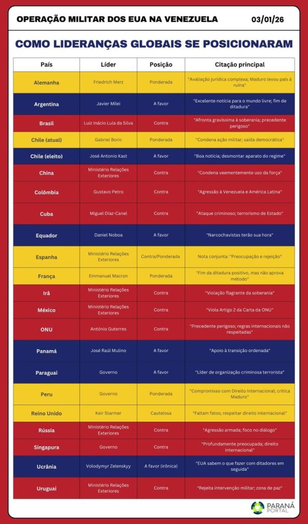Afirmou que “o fim de uma ditadura é positivo, mas o método adotado pelos Estados Unidos é juridicamente questionável”. - Alemanha (Friedrich Merz):