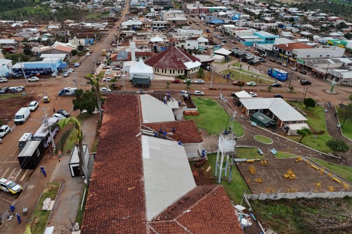 Imagem de drone, feita pela Agência Estadual de Notícias, mostra recuperação da cidade de Rio Bonito do Iguaçu, devastada por um tornado na tarde do dia sete de novembro.